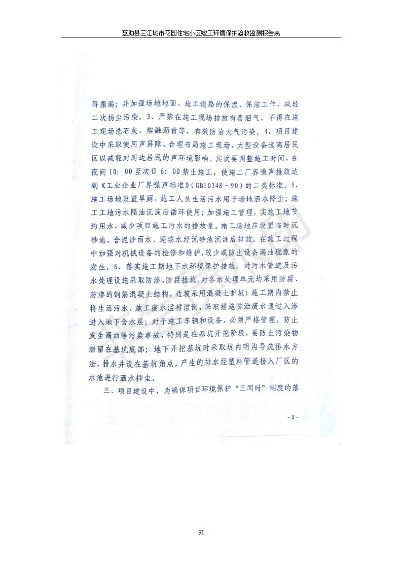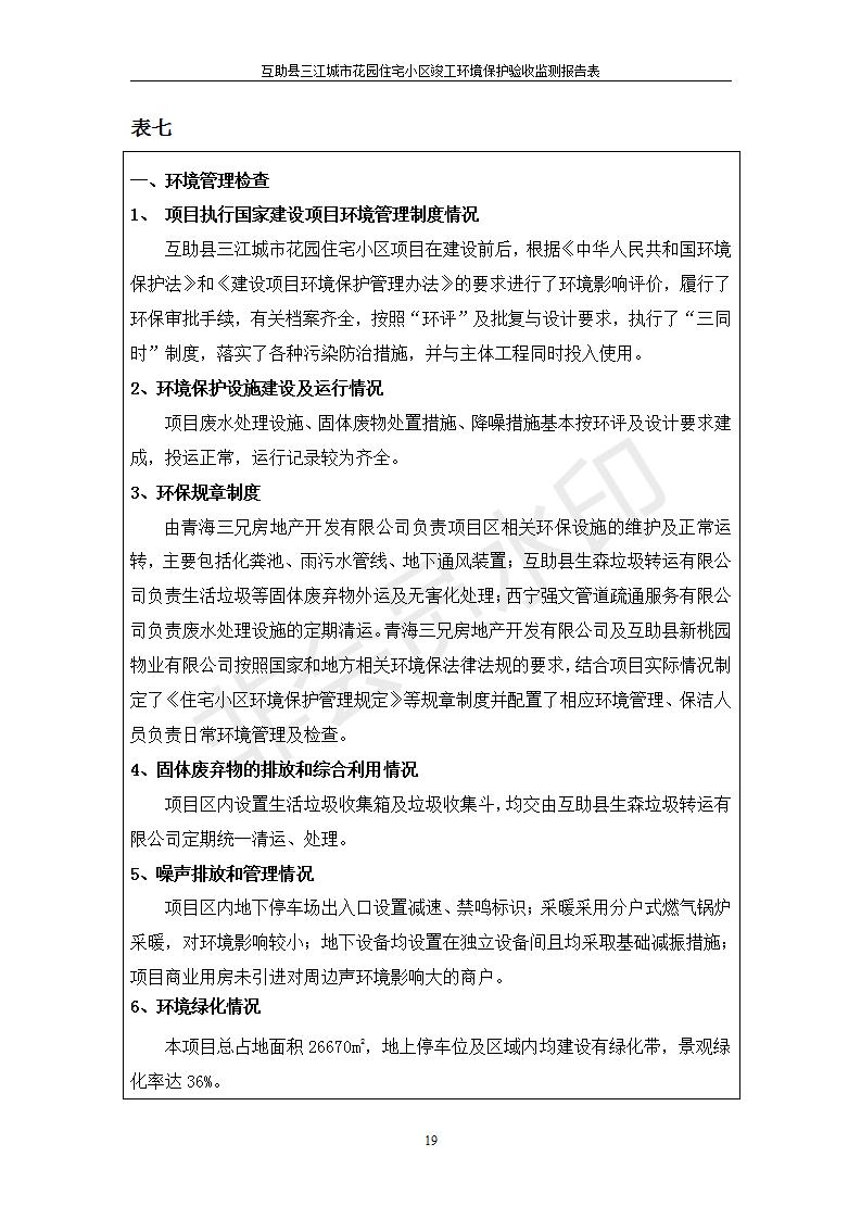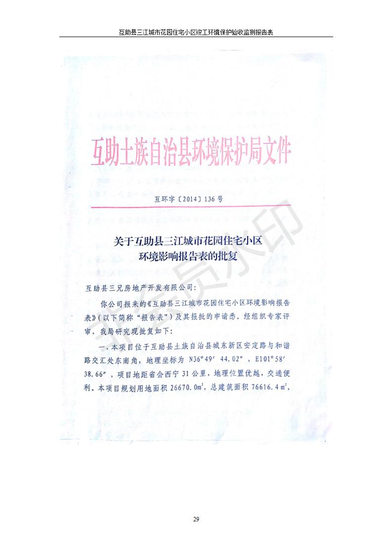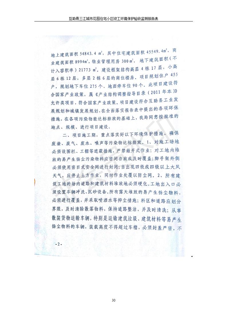 根據(jù)中華人民共和國國務(wù)院令第682號《國務(wù)院關(guān)于修改〈建設(shè)項目環(huán)境保護管理條例〉的決定》和《建設(shè)項目竣工環(huán)境保護驗收暫行辦法》(國務(wù)院令682號),互助縣三江城市花園住宅小區(qū)(包括竣工環(huán)境保護驗收監(jiān)測報告表和驗收意見)公示如下。 一、項目名稱: 互助縣三江城市花園住宅小區(qū)竣工環(huán)境保護驗收監(jiān)測報告表 二、地點:青海省海東市互助土族自治縣威遠鎮(zhèn)安定路與和諧路交匯處東南角 三、建設(shè)單位:青海三兄房地產(chǎn)開發(fā)有限公司 四、建設(shè)內(nèi)容:項目規(guī)劃用地面積26670.0m2,實際占地面積26670.0m2,項目占地面積未發(fā)生變化,規(guī)劃設(shè)計建筑總面積76616.4m2,其中商業(yè)建筑面積8994m2。實際建筑總面積58639.64m2,其中商業(yè)建筑面積9894.27m2。 五、聯(lián)系人:張工 六、聯(lián)系電 話:0971-6515411 七、公示時間:二〇一九年六月五日至二〇一九年七月三日 公示期間,對上述公示內(nèi)容如有異議,請以書面形式反饋,個人須署真實姓名,單位須加蓋公章。