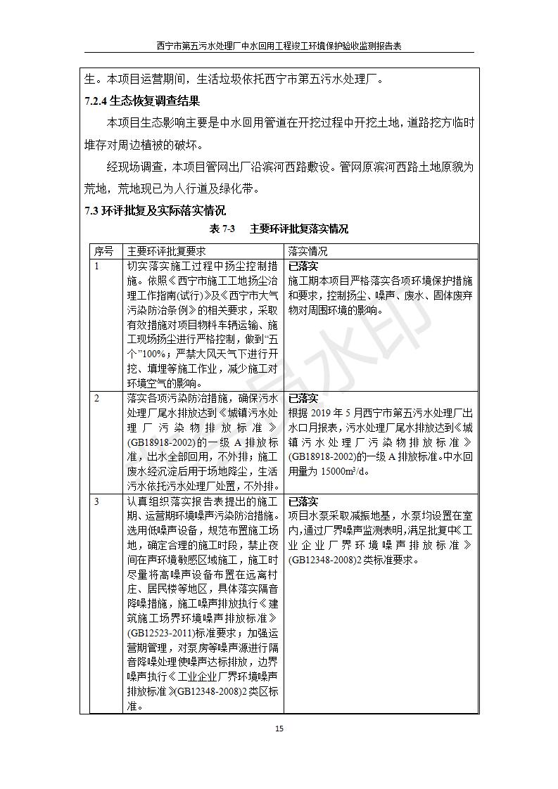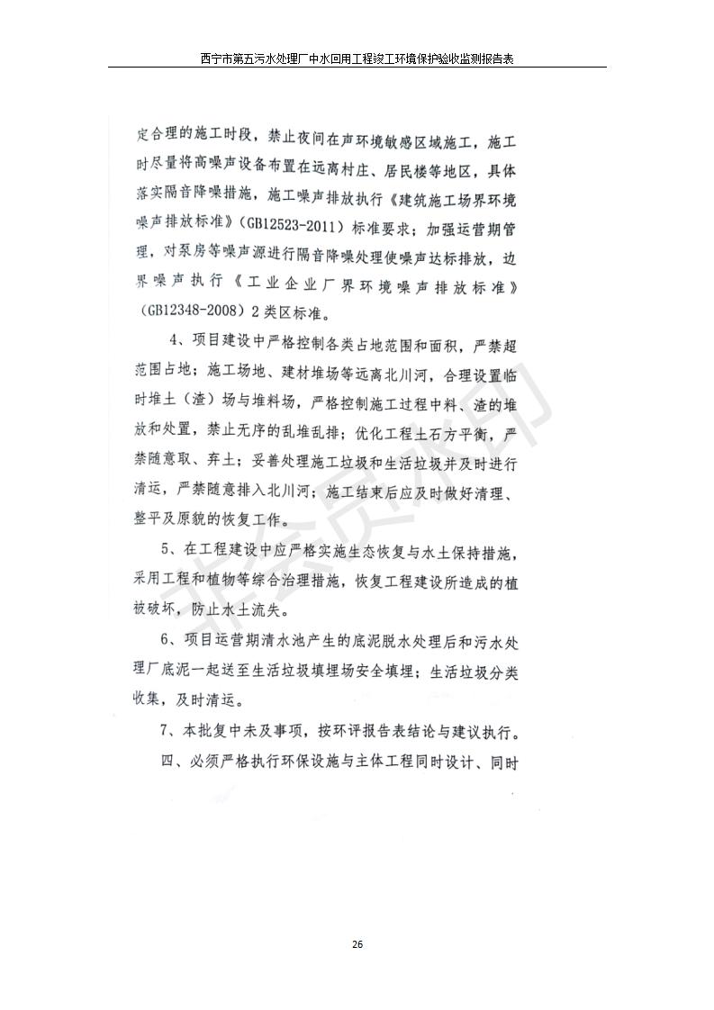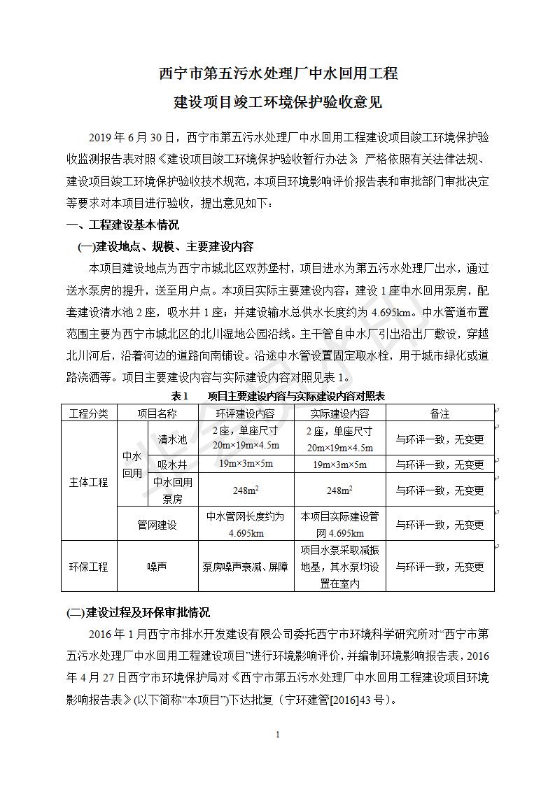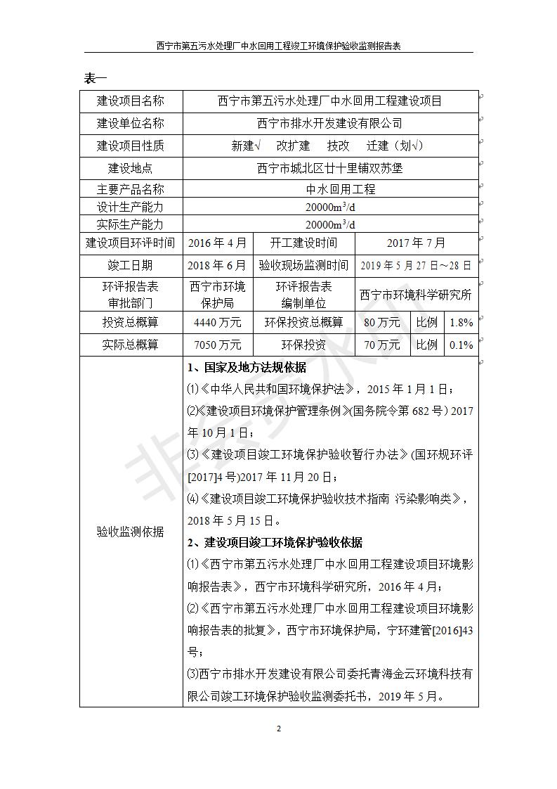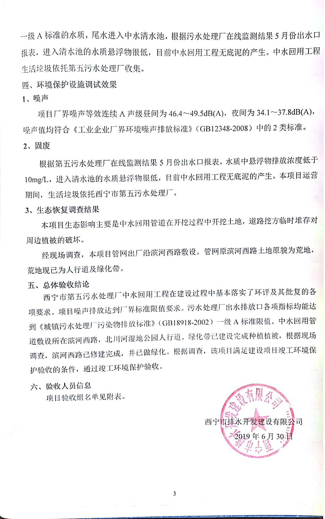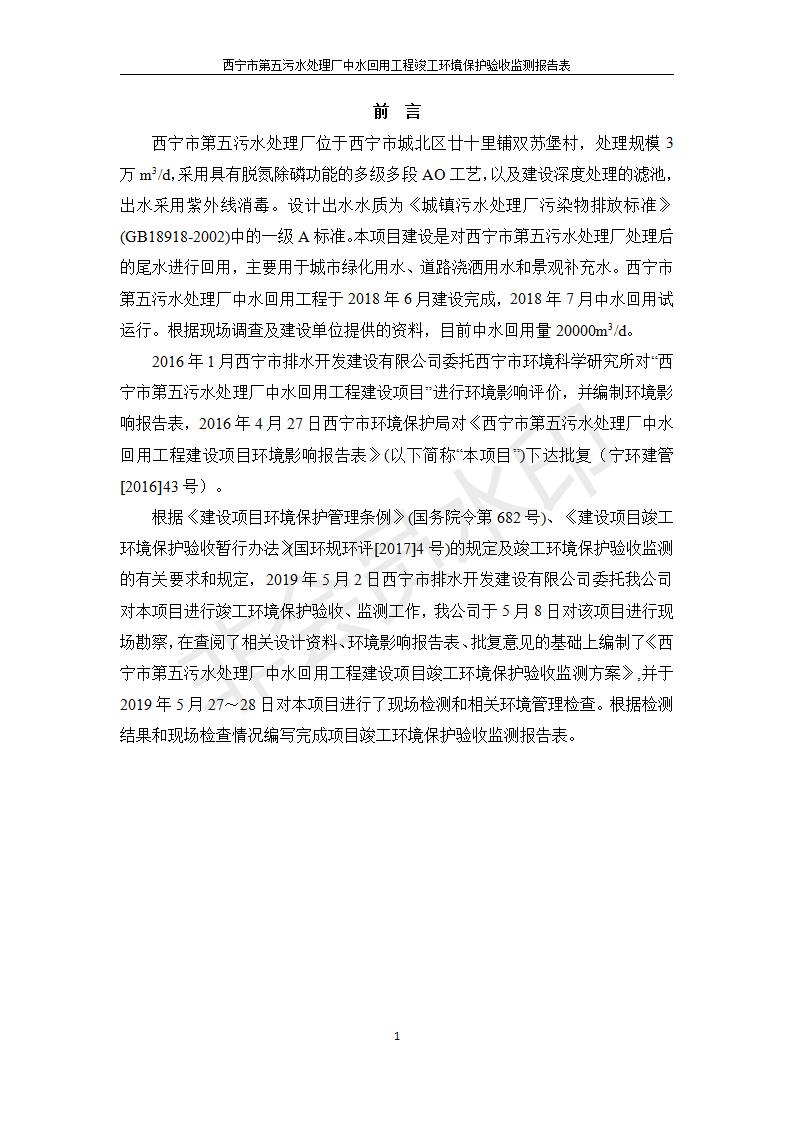 根據(jù)中華人民共和國國務(wù)院令第682號《國務(wù)院關(guān)于修改〈建設(shè)項目環(huán)境保護(hù)管理條例〉的決定》和《建設(shè)項目竣工環(huán)境保護(hù)驗收暫行辦法》(國務(wù)院令682號),西寧市第五污水處理廠中水回用工程建設(shè)項目(包括竣工環(huán)境保護(hù)驗收監(jiān)測報告表和驗收意見)公示如下。 一、項目名稱:西寧市第五污水處理廠中水回用工程建設(shè)項目 二、地點:西寧市城北區(qū)廿十里鋪雙蘇堡 三、建設(shè)單位:西寧市排水開發(fā)建設(shè)有限公司