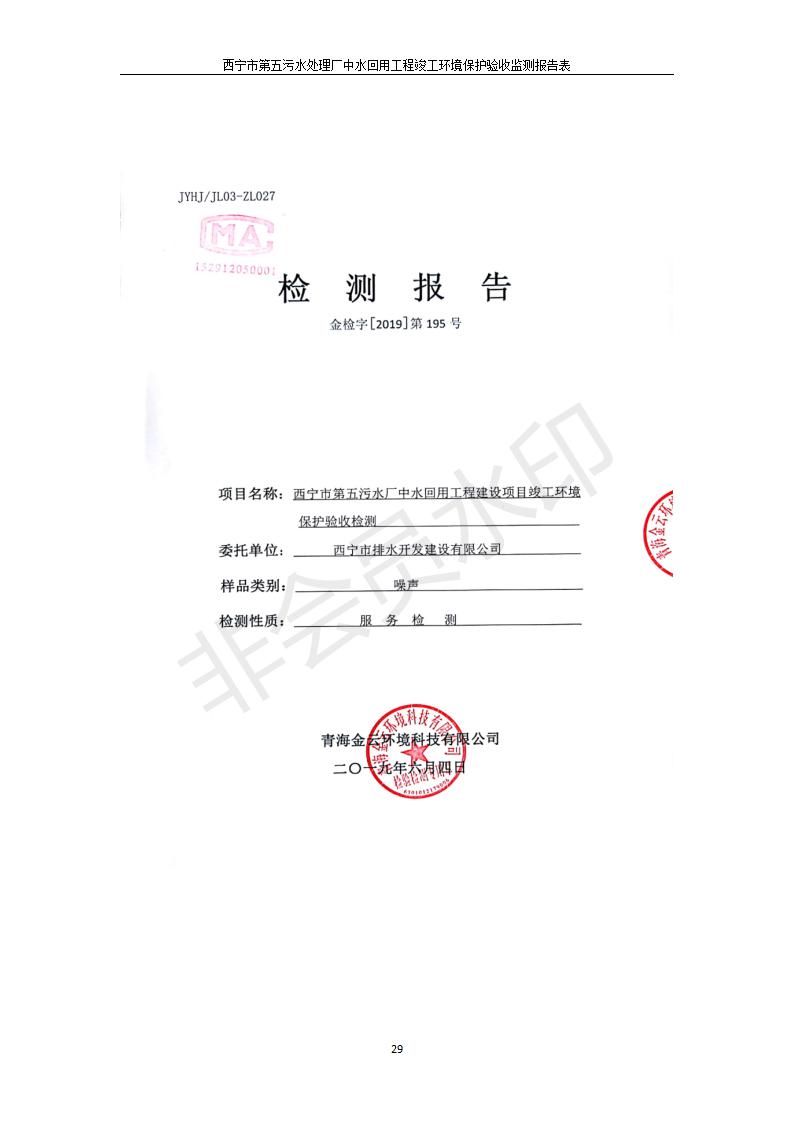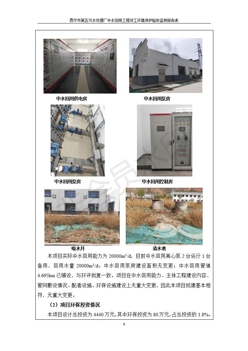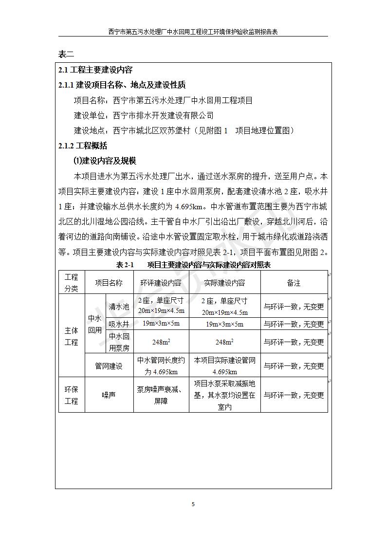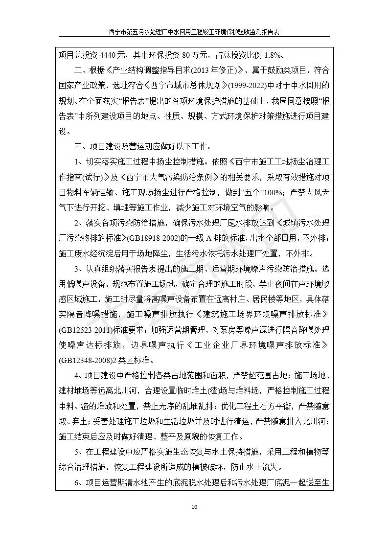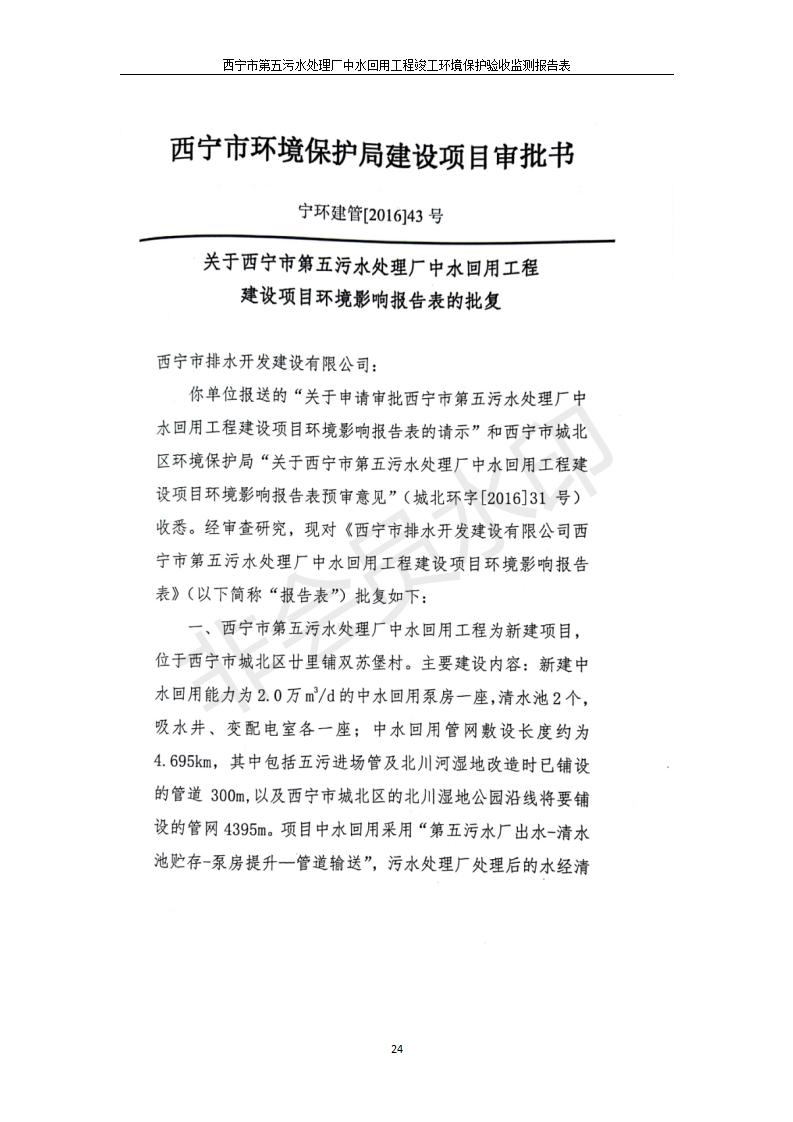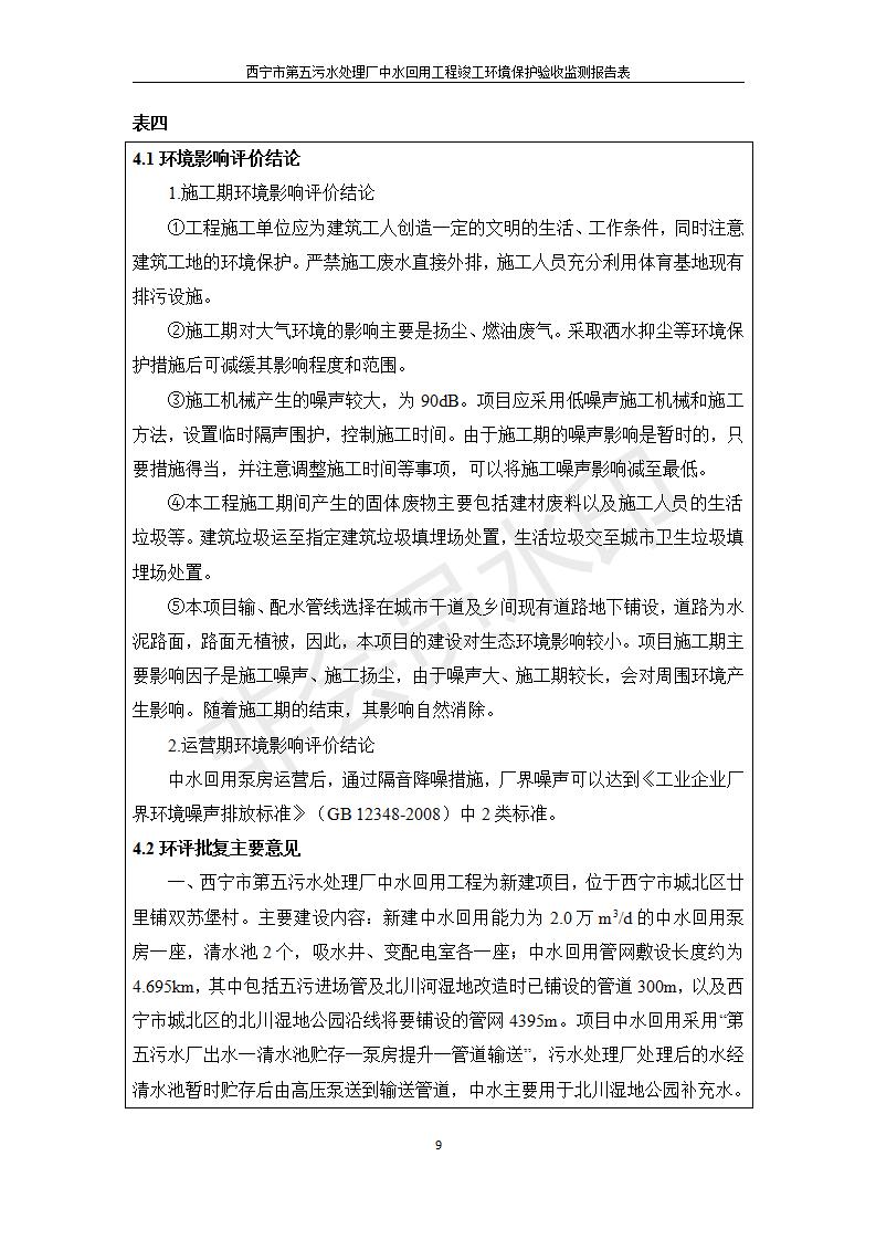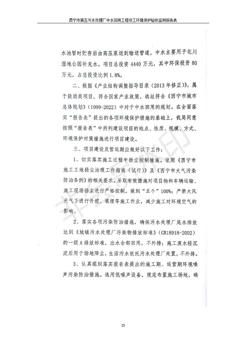 根據(jù)中華人民共和國國務(wù)院令第682號《國務(wù)院關(guān)于修改〈建設(shè)項目環(huán)境保護(hù)管理條例〉的決定》和《建設(shè)項目竣工環(huán)境保護(hù)驗收暫行辦法》(國務(wù)院令682號),西寧市第五污水處理廠中水回用工程建設(shè)項目(包括竣工環(huán)境保護(hù)驗收監(jiān)測報告表和驗收意見)公示如下。 一、項目名稱:西寧市第五污水處理廠中水回用工程建設(shè)項目 二、地點:西寧市城北區(qū)廿十里鋪雙蘇堡 三、建設(shè)單位:西寧市排水開發(fā)建設(shè)有限公司