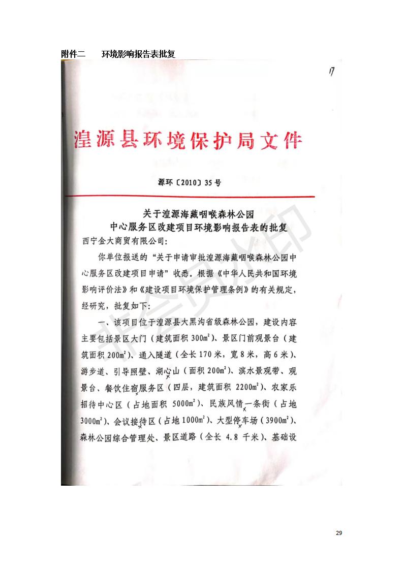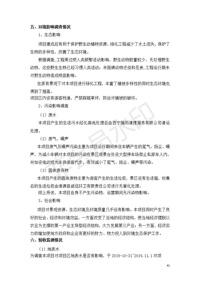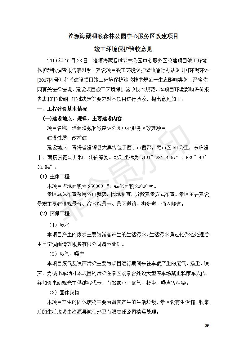 根據(jù)中華人民共和國(guó)國(guó)務(wù)院令第682號(hào)《國(guó)務(wù)院關(guān)于修改〈建設(shè)項(xiàng)目環(huán)境保護(hù)管理?xiàng)l例〉的決定》和《建設(shè)項(xiàng)目竣工環(huán)境保護(hù)驗(yàn)收暫行辦法》(國(guó)務(wù)院令682號(hào)),湟源海藏咽喉森林公園中心服務(wù)區(qū)改建項(xiàng)目(階段性),(包括竣工環(huán)境保護(hù)驗(yàn)收調(diào)查表和驗(yàn)收意見(jiàn))公示如下。 一、項(xiàng)目名稱(chēng):湟源海藏咽喉森林公園中心服務(wù)區(qū)改建項(xiàng)目(階段性) 竣工環(huán)境保護(hù)驗(yàn)收調(diào)查表 二、地點(diǎn):青海省湟源縣東峽鄉(xiāng)大黑溝 三、建設(shè)單位:西寧金大旅游開(kāi)發(fā)有限公司 四、建設(shè)內(nèi)容:本次階段性驗(yàn)收以自然景觀為主,建設(shè)內(nèi)容為濱水景觀帶、觀景臺(tái)、景區(qū)道路及基礎(chǔ)設(shè)施。項(xiàng)目范圍從景區(qū)大門(mén)至中心位置,全長(zhǎng)4800m。 五、聯(lián)系人:張工 六、聯(lián)系電 話:0971-6515411 七、公示時(shí)間:二〇二〇年四月二十九日至二〇二〇年五月二十八日 公示期間,對(duì)上述公示內(nèi)容如有異議,請(qǐng)以書(shū)面形式反饋,個(gè)人須署真實(shí)姓名,單位須加蓋公章。